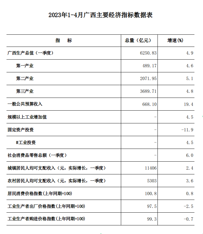 2023年1-4月广西主要经济指标数据表