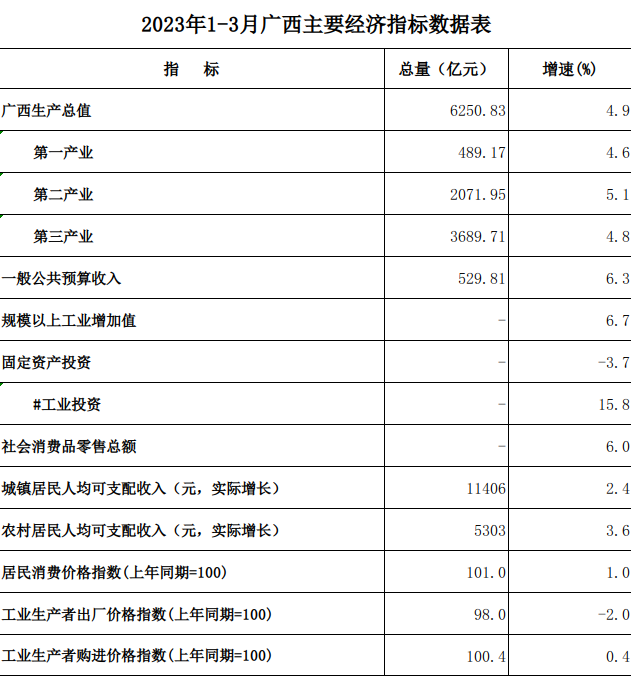 2023年1-3月广西主要经济指标数据表