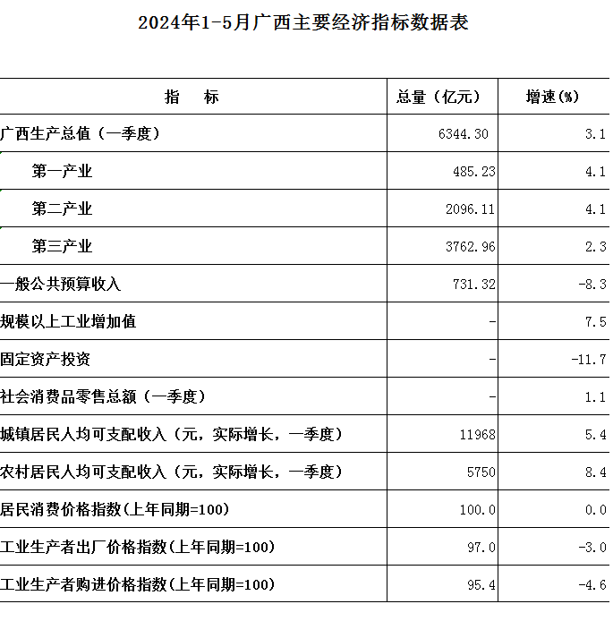 2024年1-5月广西主要经济指标数据表
