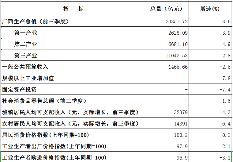 2024年1-10月广西主要经济指标数据表