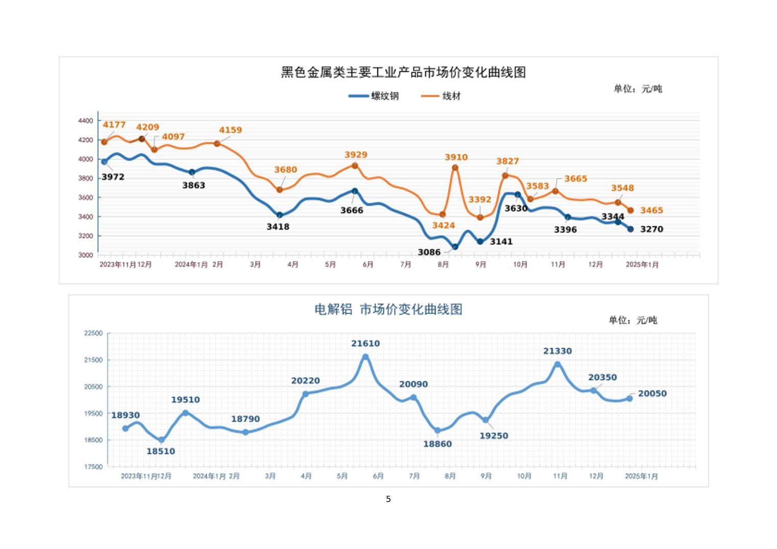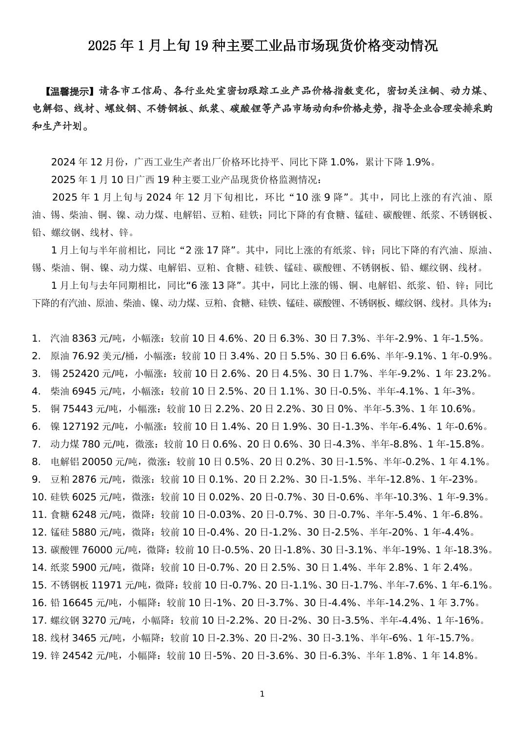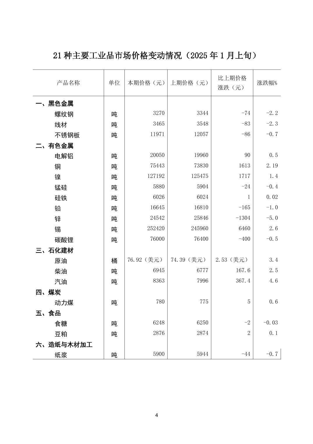 2025年1月上旬19种主要工业品市场现货价格变动情况