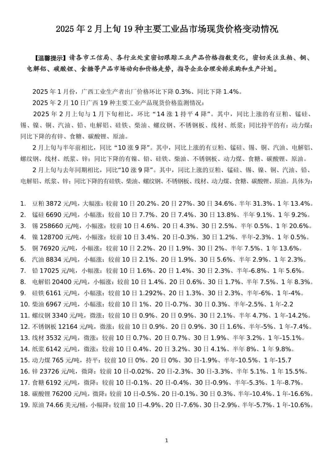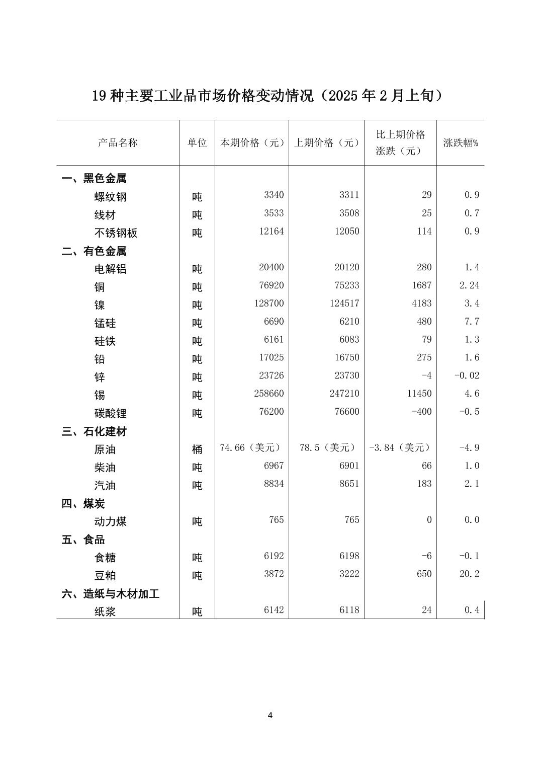 2025年2月上旬19种主要工业品市场现货价格变动情况