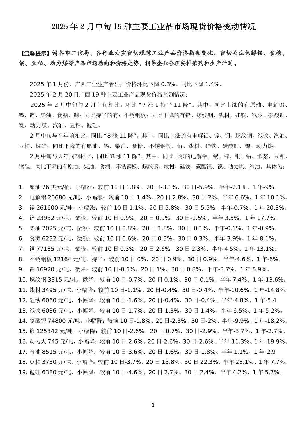 2025年2月中旬19种主要工业品市场现货价格变动情况