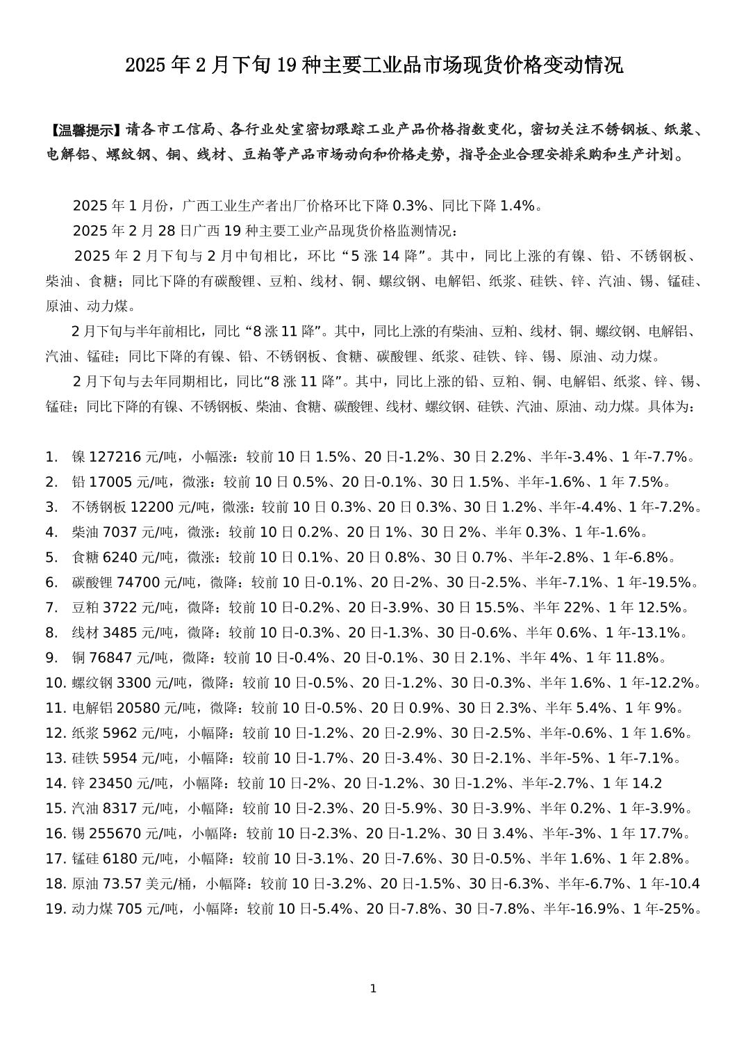 2025年2月下旬19种主要工业品市场现货价格变动情况