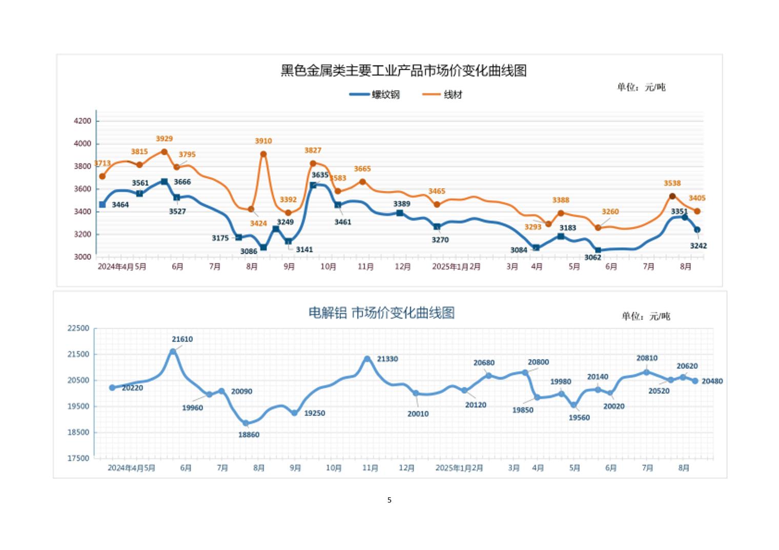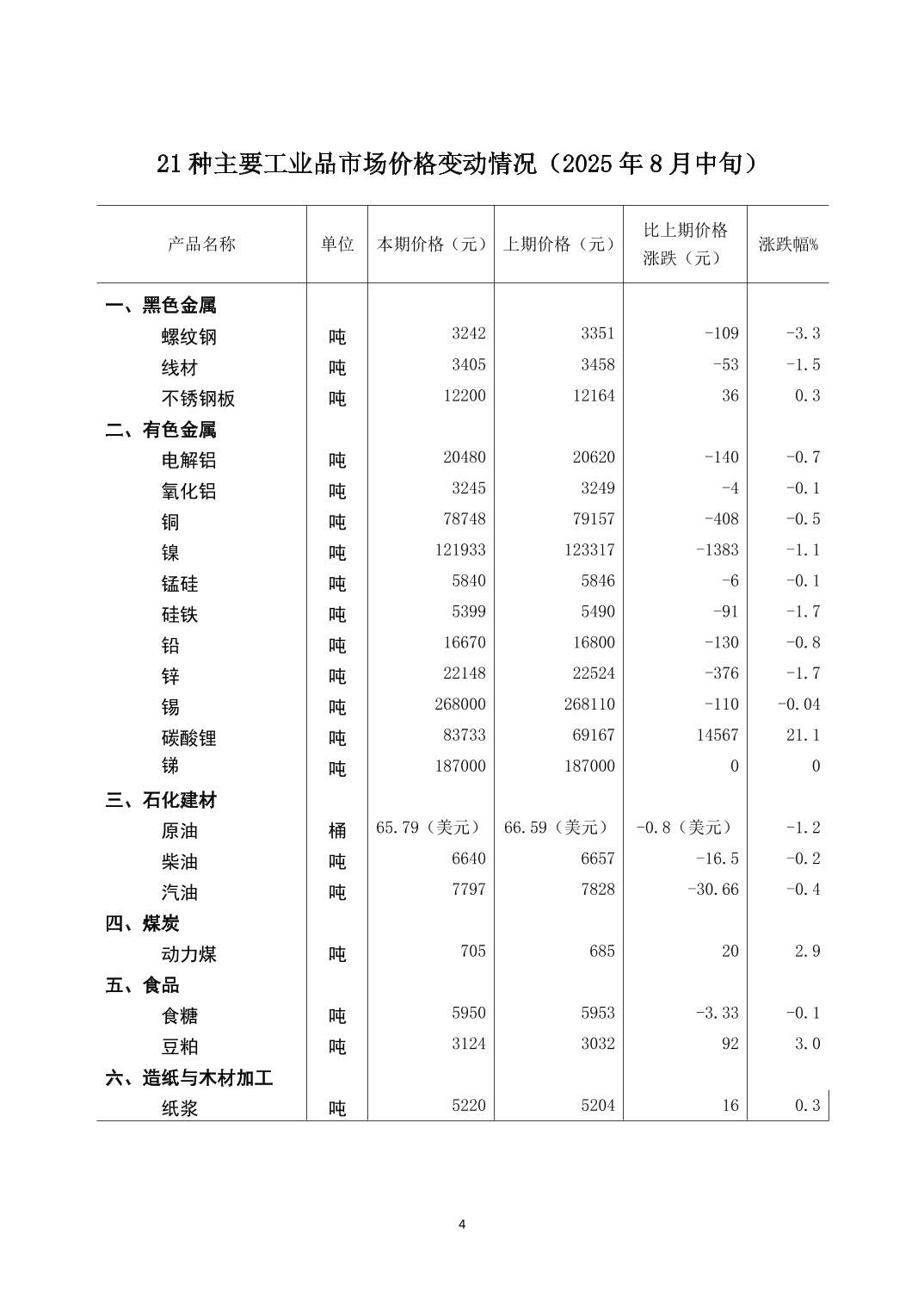 2025年8月中旬21种主要工业品市场现货价格变动情况