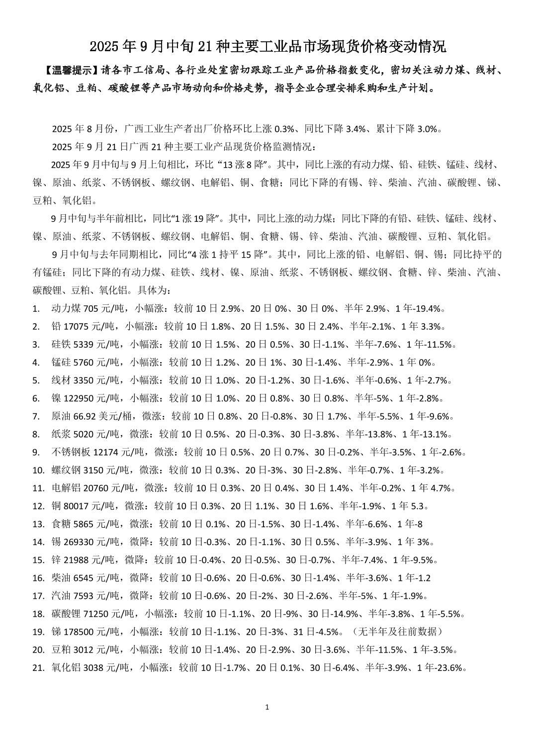 2025年9月中旬21种主要工业品市场现货价格变动情况