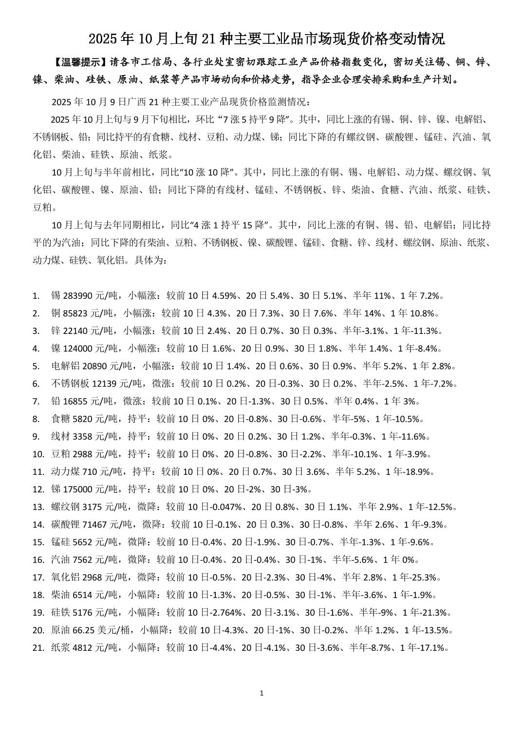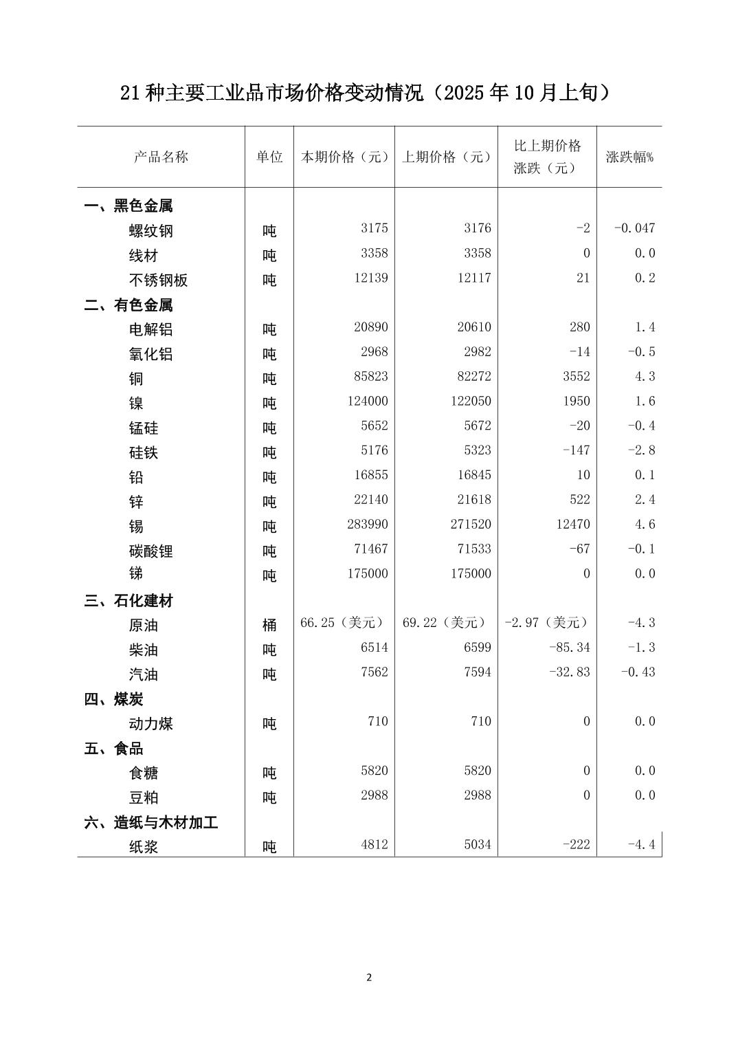 2025年10月上旬21种主要工业品市场现货价格变动情况