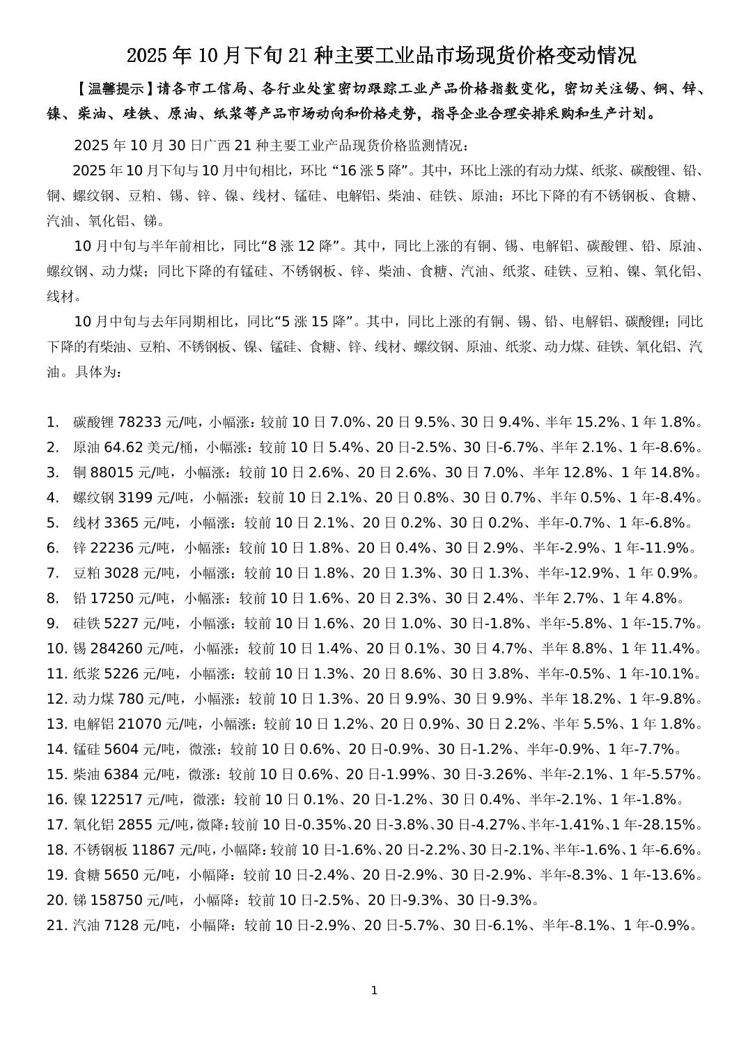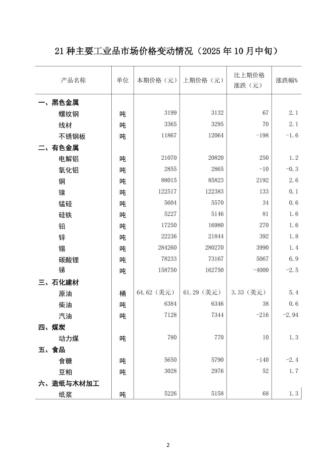 2025年10月下旬21种主要工业品市场现货价格变动情况