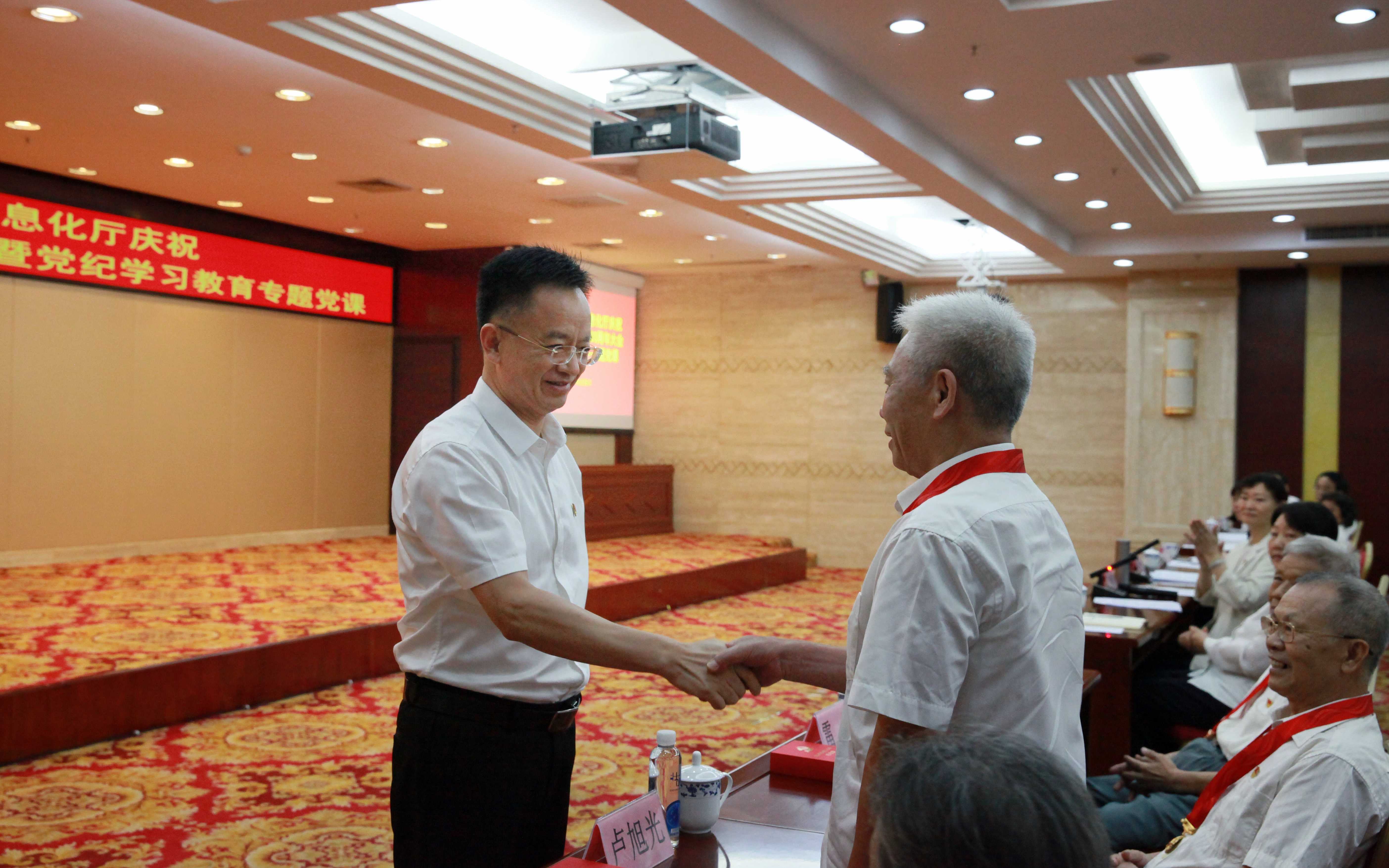 会上,全体党员唱国歌,重温入党誓词。王永超为5位退休老党员代表颁发“光荣在党50年”纪念章,并向他们表示衷心的祝贺和崇高的敬意。同时,也向退休老党员代表以及全体党员同志表示亲切的节日问候。会议通报了党建品牌建设工作进展情况,对厅属各级党组织紧紧围绕“党旗领航 工业振兴”积极创建“十佳党建品牌”的情况进行了通报。