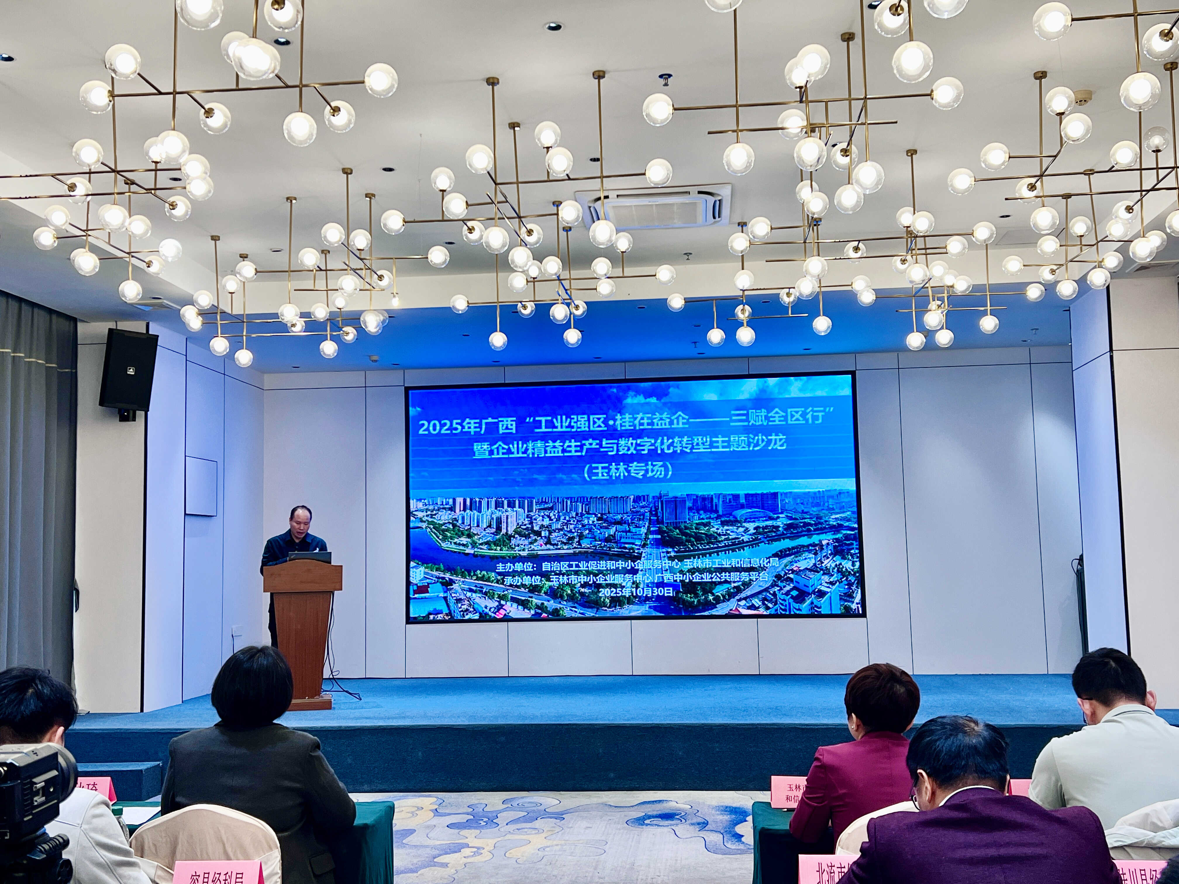2025年10月30日,由自治区工业促进和中小企业服务中心、玉林市工业和信息化局联合主办的“工业强区·桂在益企—三赋全区行”暨企业精益生产与数字化转型主题沙龙在玉林市成功举办。来自全区近60家机械装备制造、新材料、纺织服装、食品等行业的企业代表,以及高校院所、服务机构、政府部门的代表,共计90人齐聚一堂,共同探讨科技创新与数字化转型“赋智、赋能、赋值”企业发展的可行方案。