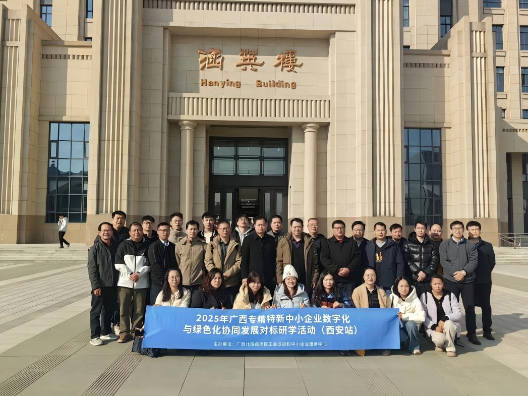 2025年11月30日至12月5日,广西专精特新中小企业数字化与绿色化协同发展对标研学活动(西安站)成功举办。本次活动由广西壮族自治区工业促进和中小企业服务中心主办,中国节能协会承办,邀请广西各市工信部门、节能监察机构、重点用能企业及专精特新企业高管共同参与,旨在贯彻落实国家相关部署,助力企业把握“两化”协同发展新趋势,提升技术创新与产业链协同能力。