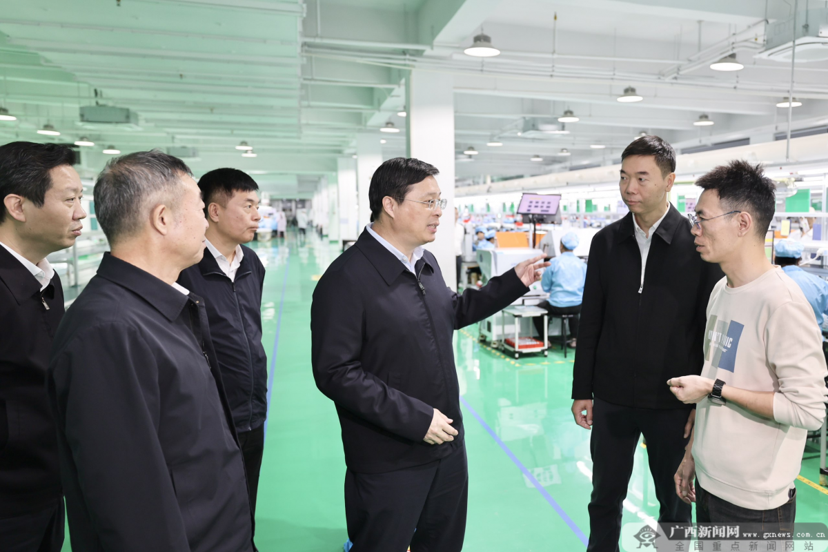 在宾阳县宾州电子信息产业园广西猎声电子科技有限公司生产车间,韦韬了解宾阳电子信息产业发展以及企业生产运营情况。记者 邓华 摄