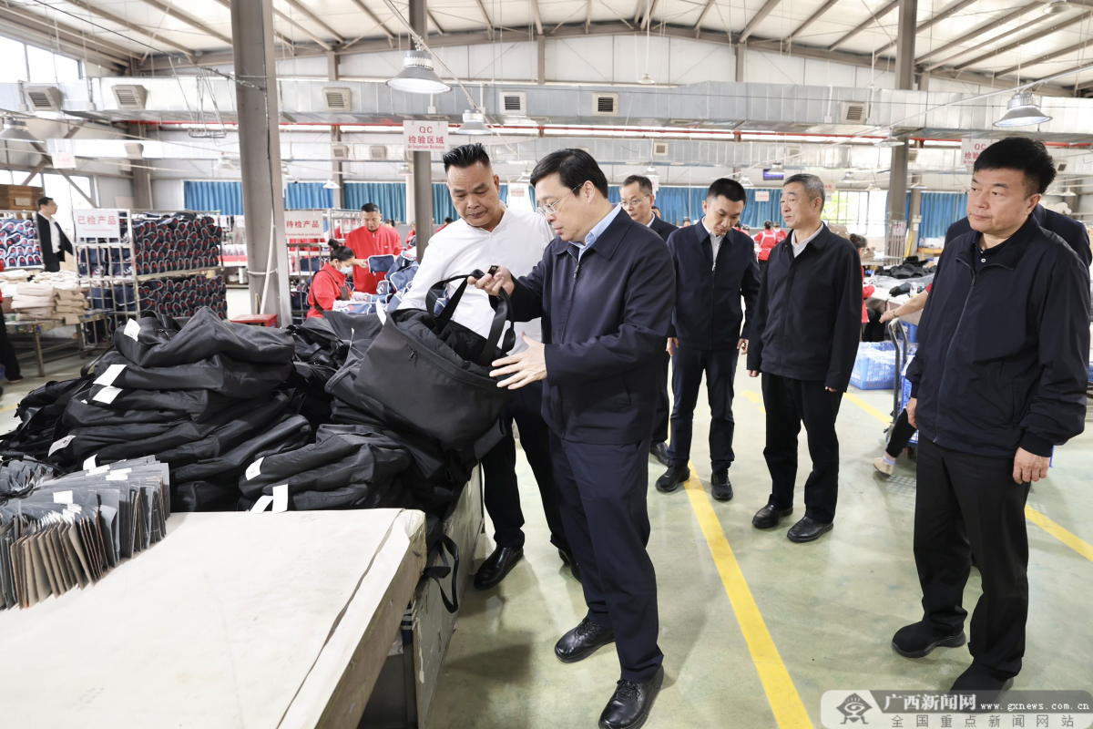 韦韬走进上林县明亮镇易地搬迁安置点南宁市中禾箱包有限公司帮扶车间,了解搬迁群众工作收入等情况。记者 邓华 摄
